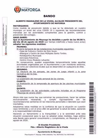 En un bando publicado, el primer edil del municipio, Alberto Magdaleno de la Viuda, ha avanzado que, a partir de las 00.00 horas del 28 de agosto, "por tiempo indefinido y hasta nuevo aviso" se cerrarán la Casa de Cultura, el Albergue y Centro de Usos Múltiples, el polideportivo, el gimnasio y el Centro Cívico, así como todas las actividades organizadas por el Ayuntamiento, monitores externos o colectivos.