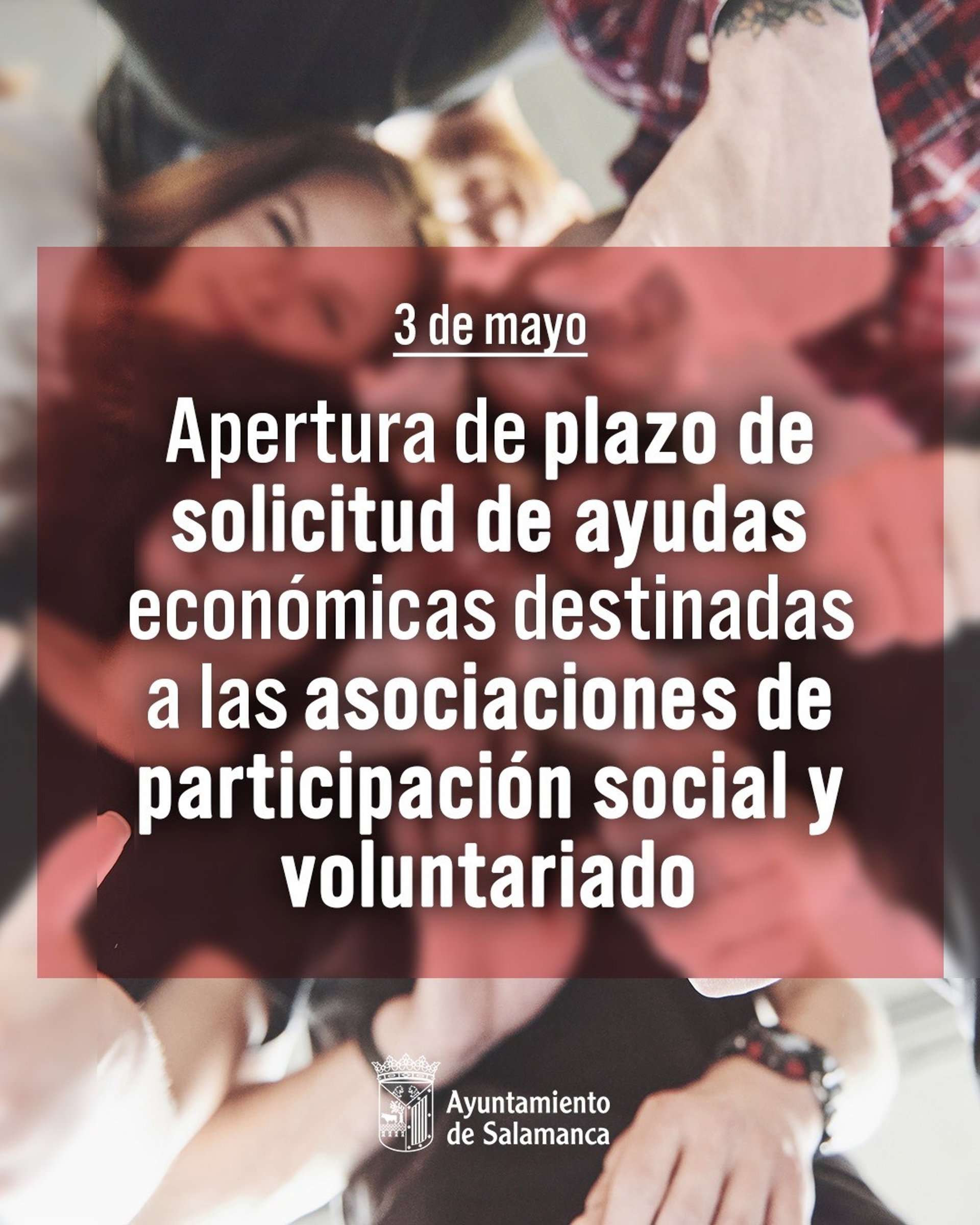 El Ayuntamiento de Salamanca abrirá este sábado, 3 de mayo, el plazo de solicitud de las ayudas económicas destinadas a las asociaciones de participación social y voluntariado con un presupuesto total de 115.000 euros, 15.000 euros más que en 2024, según ha publicado este viernes el Boletín Oficial de la Provincia.