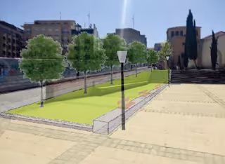 Junto a la rampa que comunica las calles Bretón y Patio de Comedias se creará un jardín en talud que salva el desnivel actual con árboles de porte y arbustivas tapizantes. Incluye una bancada corrida con varios puntos con respaldo de madera para aprovechar las sombras que generen los árboles.