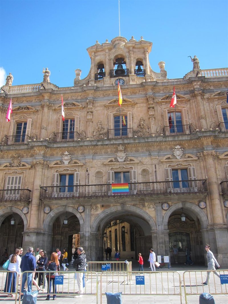 El balcón del Ayuntamiento de Salamanca, ubicado en la Plaza Mayor, luce este sábado una bandera arcoiris en apoyo al colectivo LGTB+, que celebra estos días diferentes actividades en la ciudad.