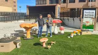 La concejal de Turismo, Yolanda Santos, y el artista de Rioseco Santiago González, conocido como 'Bongui', presentan las réplicas de las especies micológicas. - EUROPA PRESS