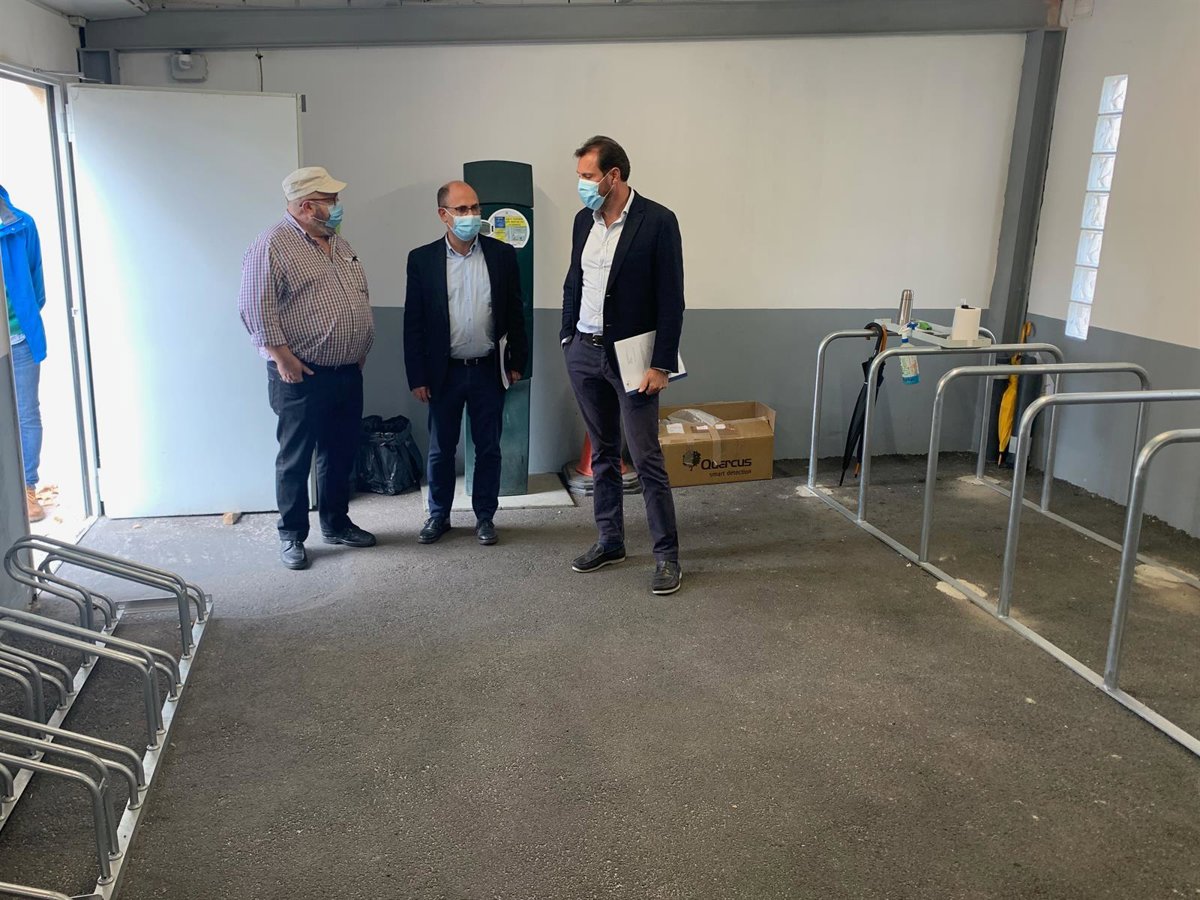 El alcalde, Óscar Puente, (dcha), y el concejal de Movilidad y Espacio Urbano (centro), en la caseta que albergará el aparcamiento cubierto para bicicletas en la Feria de Valladolid. - EUROPA PRESS