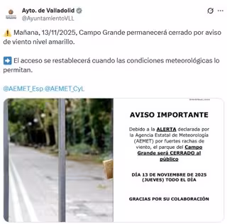 Aviso de cierre del Campo Grande de Valladolid por fuertes rachas de viento. - AYUNTAMIENTO DE VALLADOLID-@AYUNTAMIENTOVLL