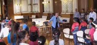 Tanto los escolares presentes en el Salón de Recepciones como los profesores que los acompañaban y los concejales del equipo de Gobierno que han asistido, se han animado a participar en varias canciones en las que la música se acompañaba con gestos de todo tipo.