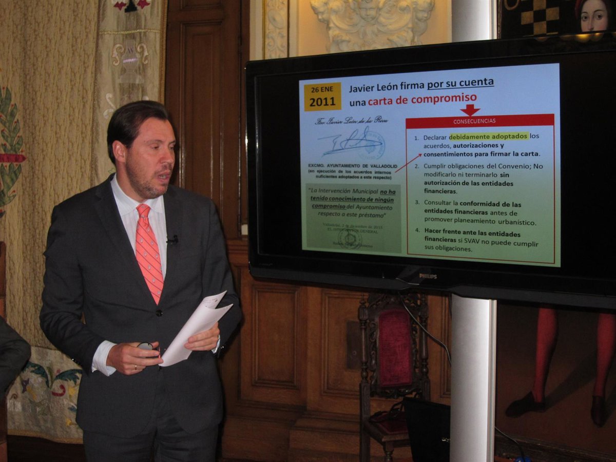 El alcalde de Valladolid, el socialista Óscar Puente, ha asegurado este lunes que el equipo de Gobierno aportará para dar fuerza a su posición de negativa a asumir la deuda que le corresponde al Ayuntamiento de Valladolid como socio de la Sociedad Valladolid Alta Velocidad, un documento conocido como "carta de compromiso" firmado por el ex primer edil Francisco Javier León de la Riva en 2011 "por su cuenta" que se utilizó como una de las garantías para la suscripción del préstamo de 400 millones de euros que un 'pool' bancario concedió a la Sociedad y cuyo primera devolución habría que afrontar antes de final de año.