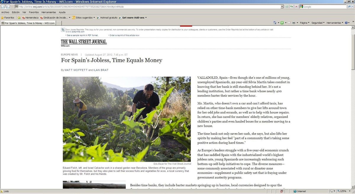 Así, bajo el título 'Para los desempleados españoles, tiempo es igual a dinero', el rotativo norteamericano recoge los casos del banco del tiempo vallisoletano, así como de otras iniciativas desarrolladas en diferentes regiones de la geografía española, tales como huertos comunitarios en Cataluña o Totana (Murcia), distintos mercados de trueque en Cataluña, el proyecto social de la ONG 'Barcelona Actúa', un banco del tiempo en Madrid o la web 'No lo tiro'.