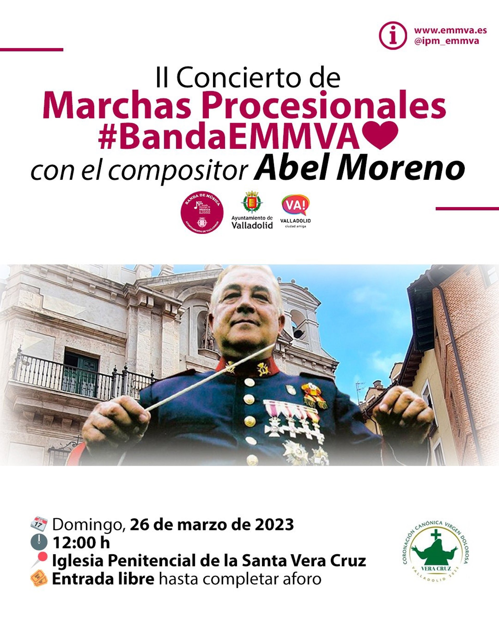 La Banda de la Escuela Municipal de Música 'Mariano de las Heras' del Ayuntamiento de Valladolid, Banda EMMVA, contará el domingo 26 de marzo con la participación del compositor Abel Moreno para la realización de su II Concierto de Marchas Procesionales, concierto en el que actuará también el Coro de la Escuela.
