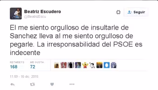 "El me siento orgulloso de insultarle de Sánchez lleva al me siento orgulloso de pegarle. La irresponsabilidad del PSOE es indecente", escribió Escudero.