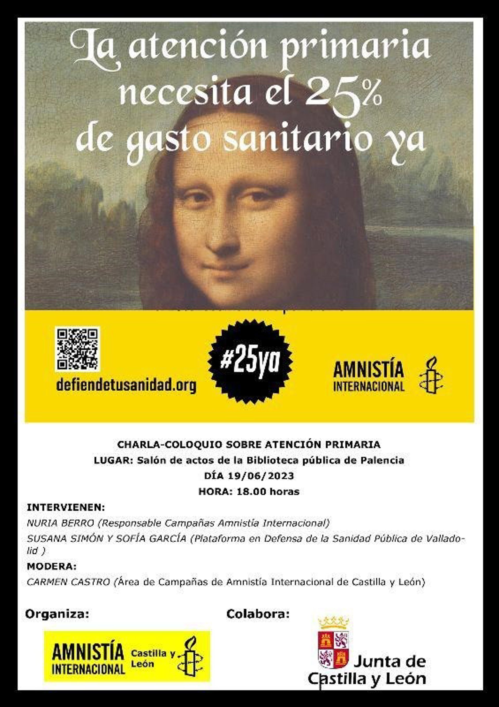 El salón de actos de la Biblioteca Pública de Palencia acoge este lunes, 19 de junio, a las 18.00 horas, una charla-coloquio sobre la Atención Primaria en Castilla y León organizada por Amnistía Internacional.