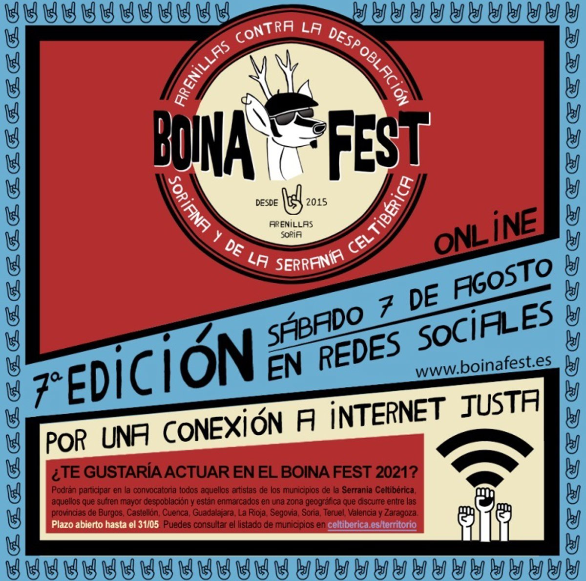 El festival de música Boina Fest, que desde 2015 se celebra en la localidad soriana de Arenillas, volverá a ser este 2021 en formato online, en una séptima edición en la que convoca a artistas sorianos o de municipios poco poblados de la Serranía Celtibérica y donde se reivindicará un acceso a Internet justo, según han informado desde la organización del evento.