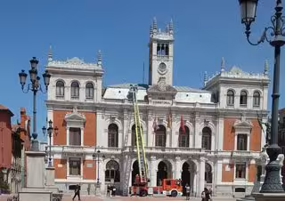 Los Bomberos de Valladolid han empleado una autoescala para que se pueda reparar una chapa del tejado de la fachada principal del Ayuntamiento de Valladolid que se encuentra dañada.