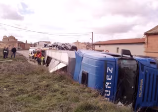 Los Bomberos de la Diputación de Valladolid han intervenido este viernes para excarcelar a los cerdos, vivos y muertos, que transportaba un camión que ha sufrido un vuelco en la travesía de la carretera N-610 en Valdunquillo y donde el conductor del vehículo ha resultado ileso.