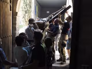 Efectivos de los Bomberos de Valladolid han colaborado este viernes en el traslado de la imagen del 'Santo Cristo al Humilladero', anónimo del siglo XV, desde la iglesia de la Vera Cruz hasta la Catedral, donde se ha instalado un taller temporal.