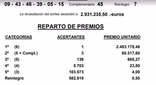 El dueño de un boleto de 'La Bonoloto' validado en Valladolid percibirá 2.483.178,46 euros al haber sido el único acertante de Primera Categoría --seis aciertos-- en el sorteo celebrado este viernes, según informó Loterías y Apuestas del Estado.