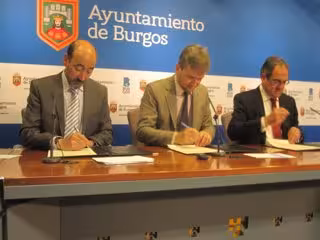 El alcalde de Burgos, Javier Lacalle, el subdelegado del Gobierno en la provincia, José María Arribas, y el delegado territorial de la Junta de Castilla y León, Baudilio Fernández-Mardomingo, han firmado el convenio de colaboración necesario para el desarrollo de esta aplicación en la ciudad durante las elecciones municipales y autonómicas.