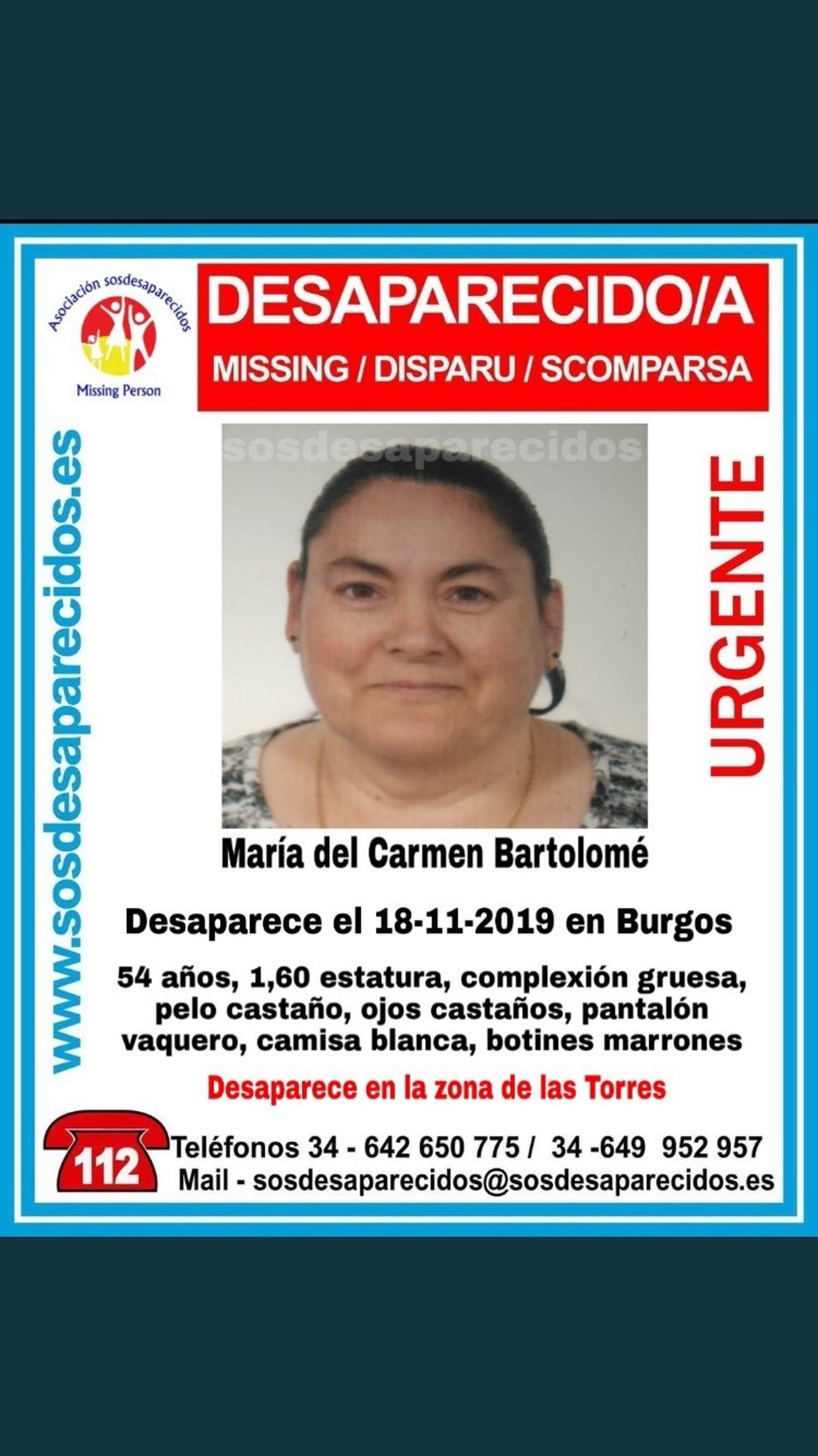 Se trata de María del Carmen Bartolomé, de 54 años, 1,60 centímetros de estatura, complexión gruesa, pelo castaño y ojos marrones, que vestía pantalón vaquero, camisa blanca y botines marrones en el momento de su desaparición.