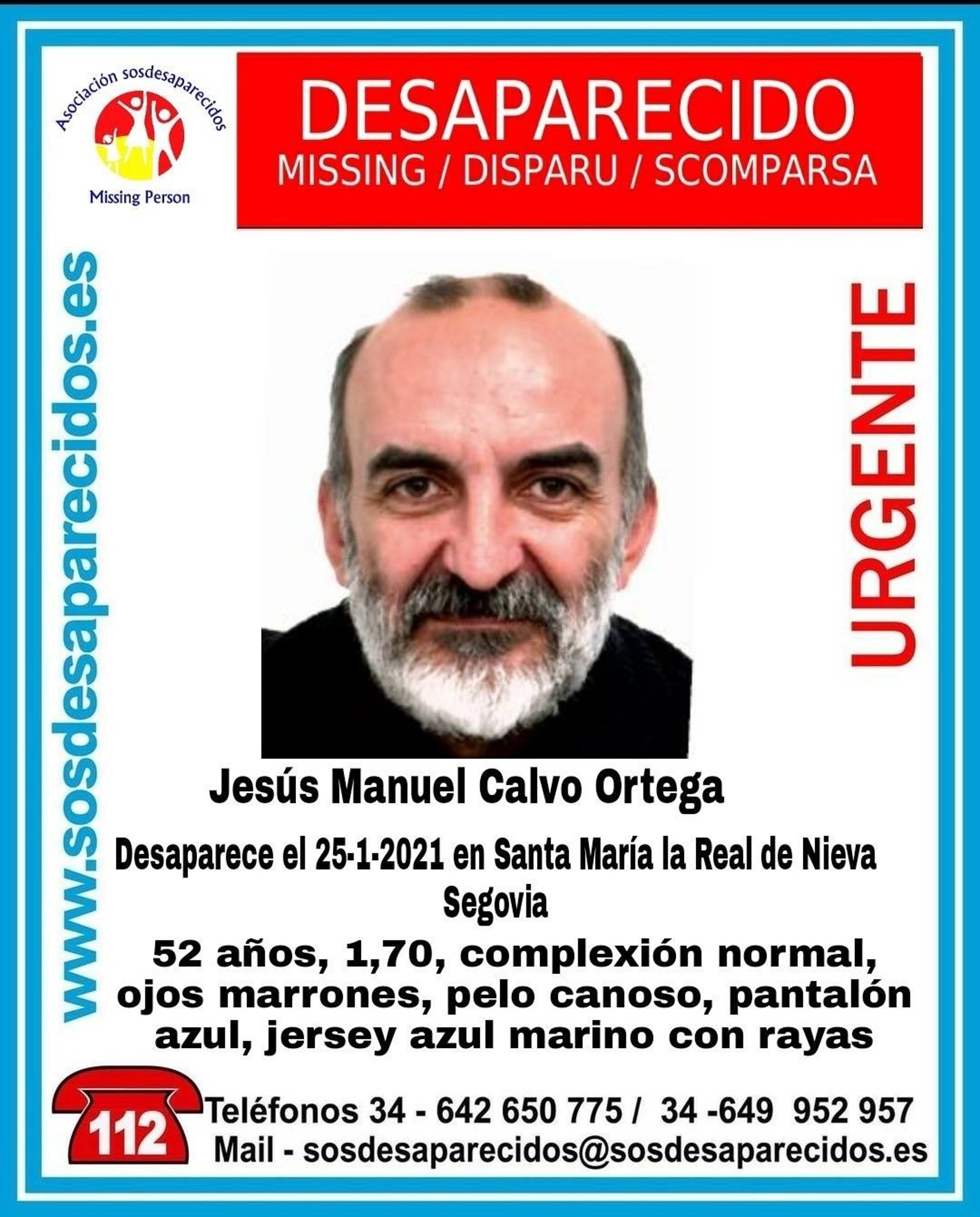 Calvo Ortega --de 52 años, 1,70 metros de estatura, ojos marrones, pelo cano y complexión normal-- ha desaparecido en el municipio segoviano de Santa María la Real de Nieva (Segovia). En el momento de su desaparición vestía un pantalón azul y un jersey azul marino a rayas.