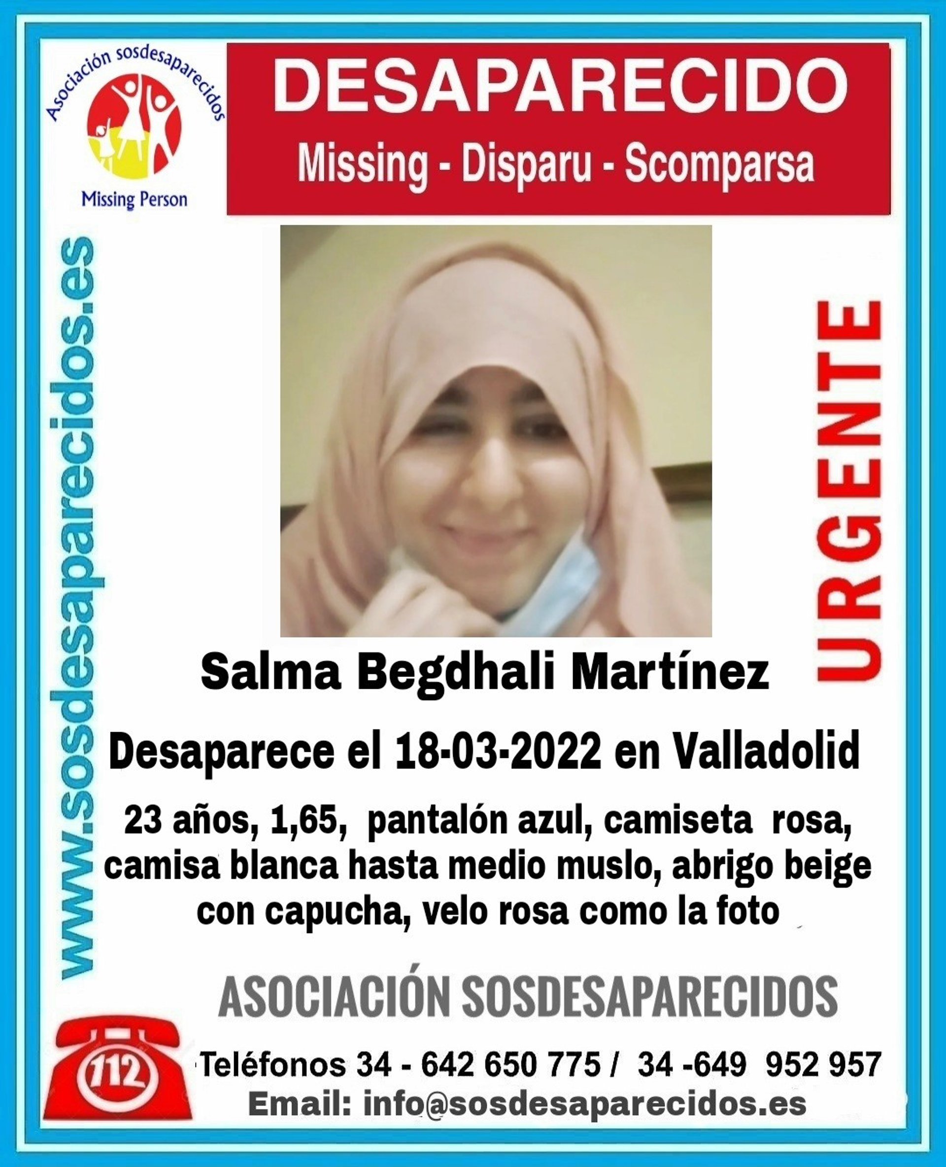 Se trata de Salma Begdali Martínez, de 165 centímetros, y que llevaba puesto un pantalón azul, una camiseta rosa, camisa blanca hasta medio muslo, abrigo beige con capucha y velo rosa.