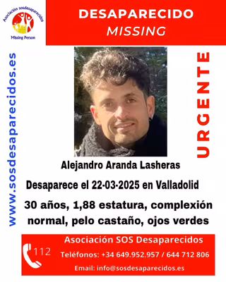 En concreto, según fuentes del colectivo, se trata de Alejandro Aranda Lasheras de 30 años. El joven tiene una estatura de 1,88 metros, es del complexión normal, tiene el pelo castaño y los ojos verdes.