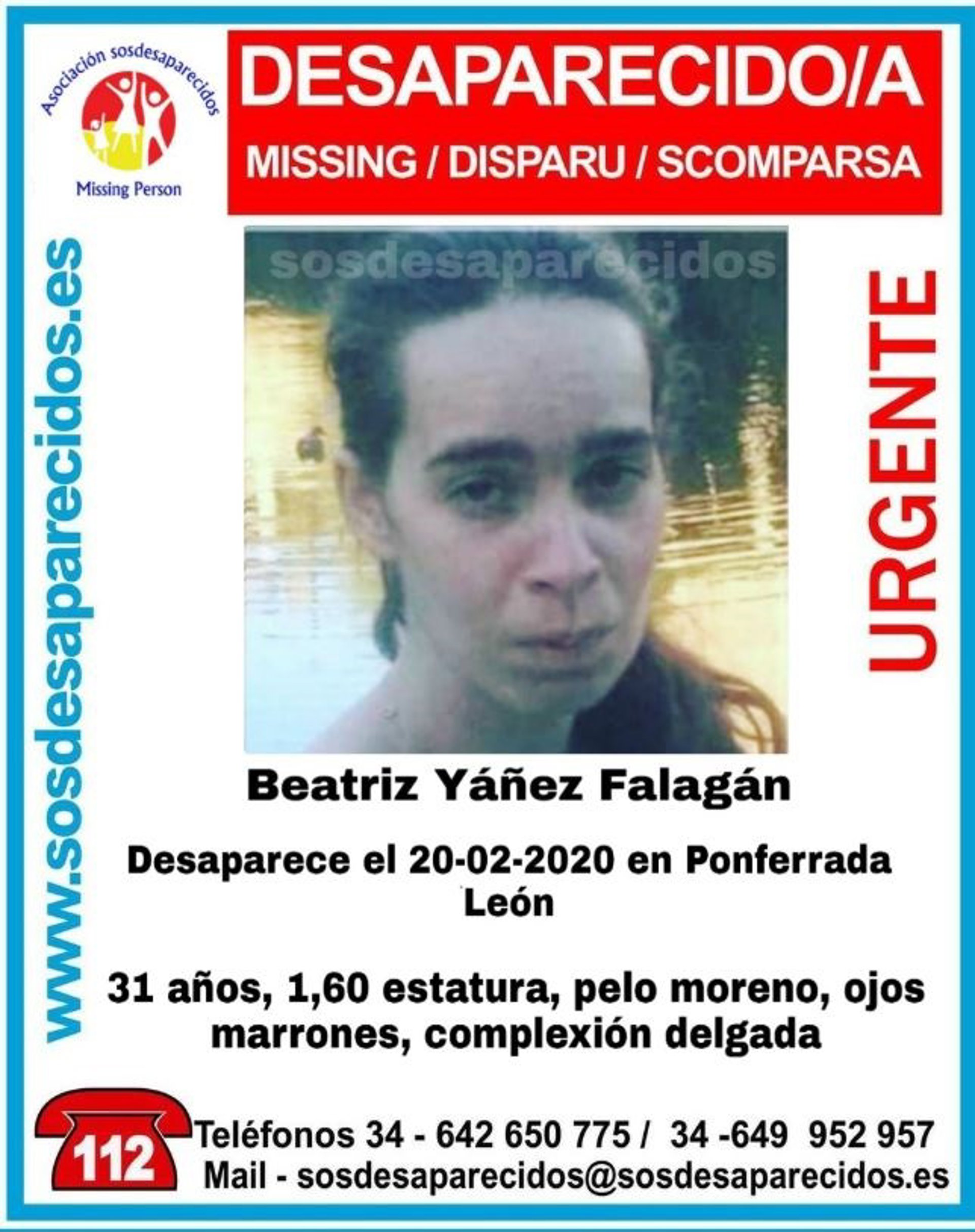 La plataforma SOS Desaparecidos ha alertado de la desaparición de una joven de 31 años, de nombre Beatriz Yáñez Falagán, a la que se vio por última vez el pasado jueves en Ponferrada (León).