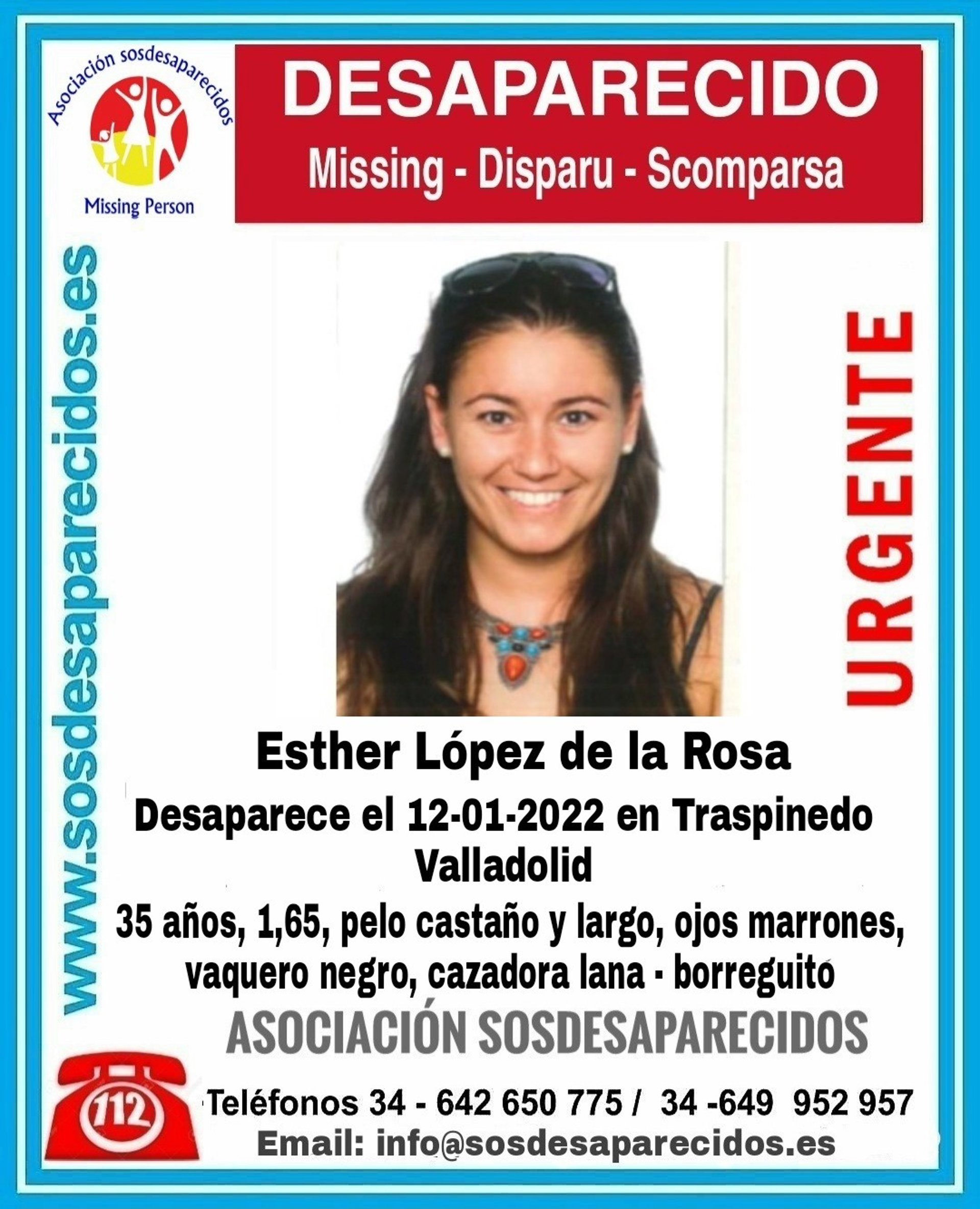 La Asociación SOSDesaparecidos ha compartido un cartel alertando de la desaparición de Esther López de la Rosa, una joven de 35 años de la que no se tienen noticias desde el pasado miércoles 12 de enero.