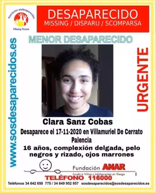 La Asociación SOS Desaparecidos ha alertado de la desaparición de Clara Sanz Cobas, menor de 16 años desaparecida desde el pasado 17 de noviembre en la localidad palentina de Villamuriel de Cerrato.