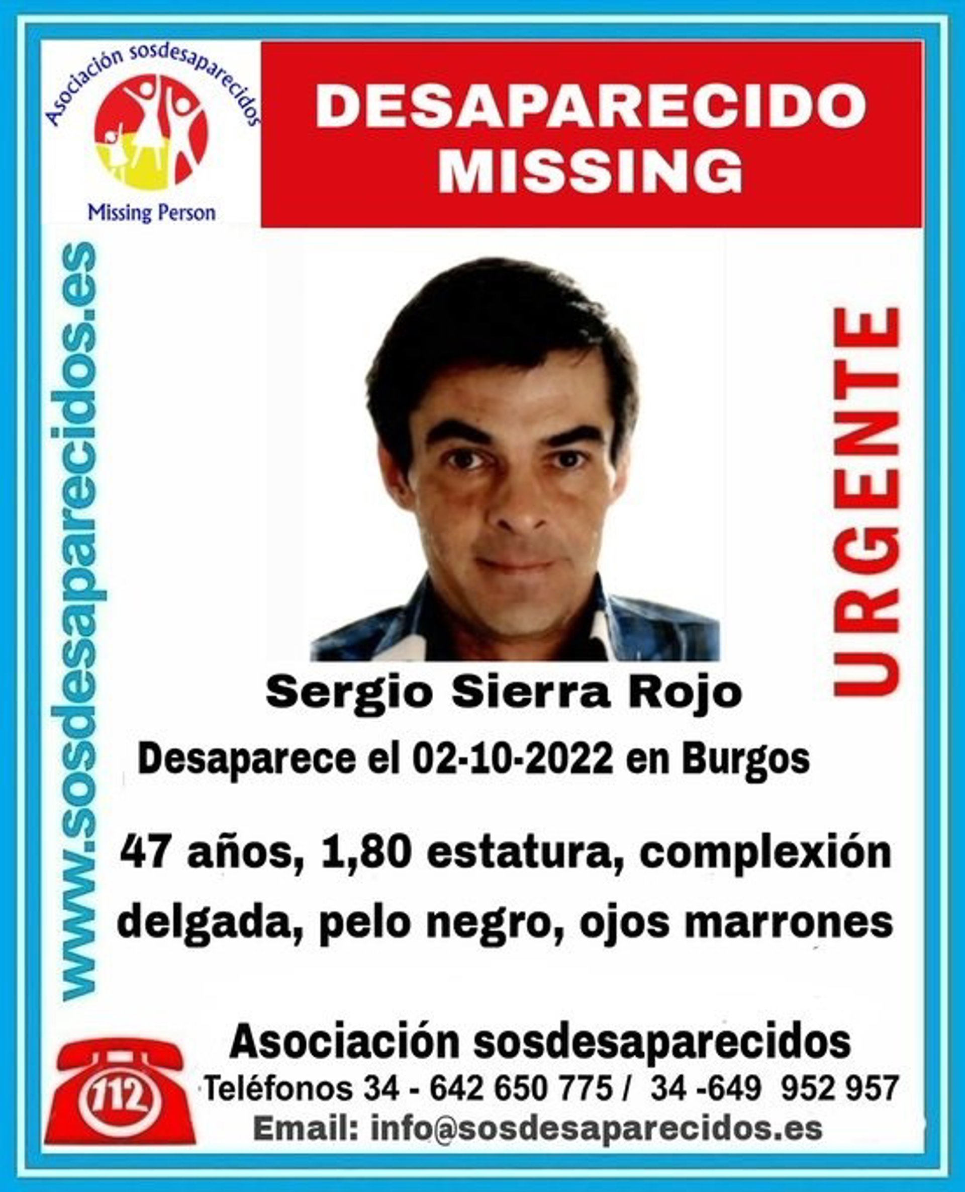 En concreto, según Alerta Desaparecidos (@sosdesaparecido), se busca a Sergio Sierra Rojo, de 47 años, de 1,80 de estatura, complexión delgada, con pelo negro y ojos marrones.