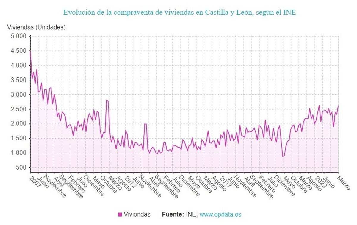 Gráfico de elaboración propia sobre la evolución de la compraventa de viviendas en CyL hasta marzo de 2023 - EPDATA