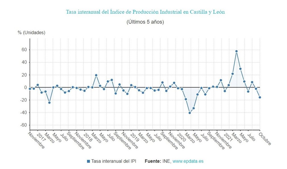 El Índice General de Producción Industrial (IPI) en Castilla y León descendió un 15,8 por ciento en octubre en relación al mismo mes de 2020, frente a un -3,3 por ciento en España que anota en este caso una tasa 4,2 puntos inferior a la de septiembre, según ha informado este viernes el Instituto Nacional de Estadística (INE).