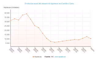 El número de hipotecas constituidas sobre viviendas en Castilla y León se situó en 1.165 en el mes de agosto de 2023 y cayó un 21,0 por ciento en comparación con el mismo mes del año anterior, menor que la media de España, donde descendió un 22,7 por ciento, según los datos difundidos este miércoles por el Instituto Nacional de Estadística (INE) y recogidos por Europa Press.