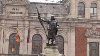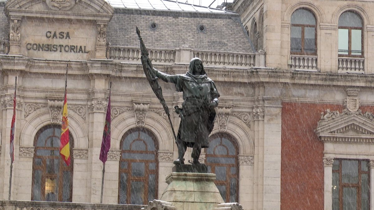 La estatua del Conde Ansúrez, en la Plaza Mayor de Valladolid, bajo la nieve. - EUROPA PRESS