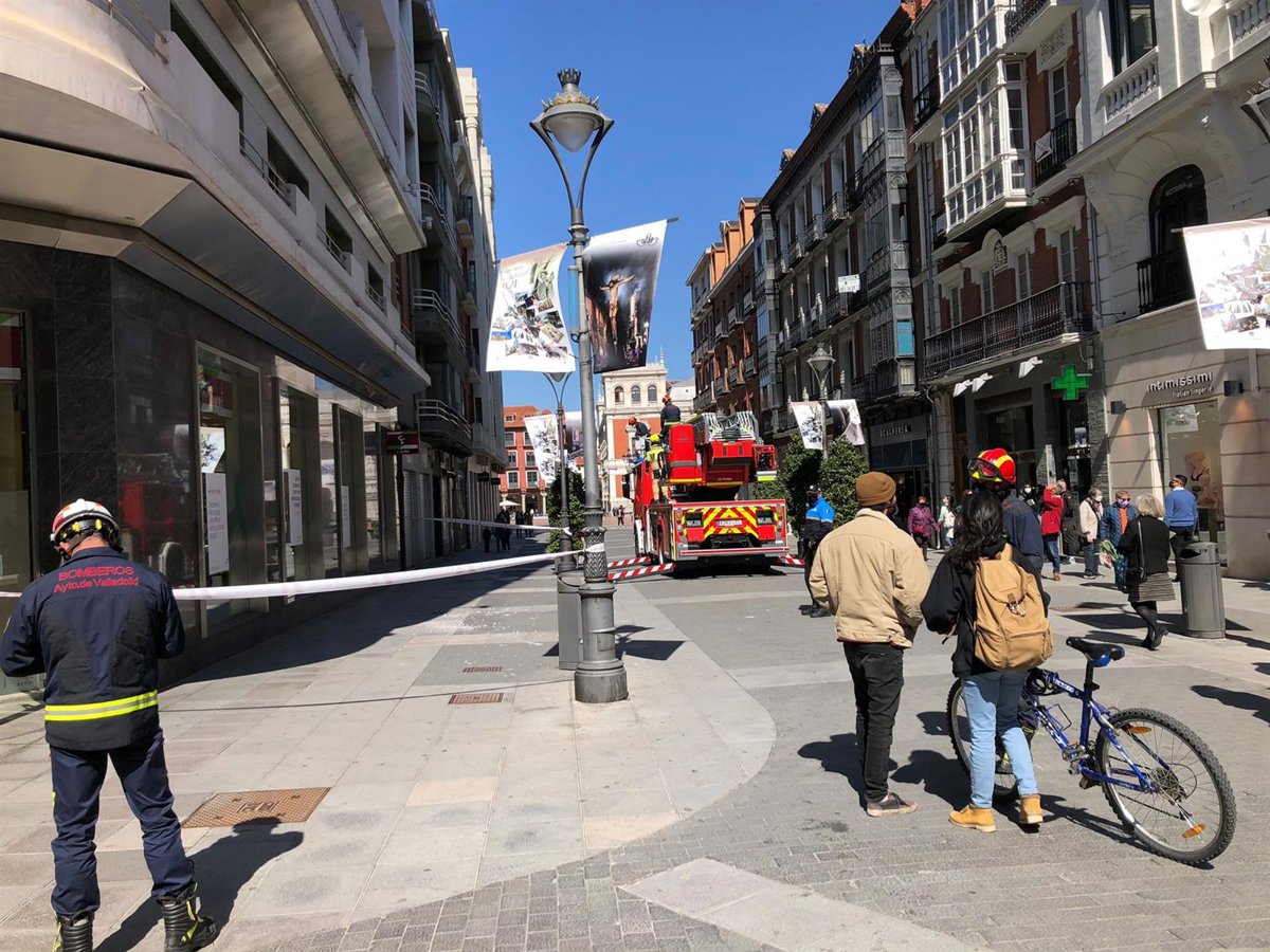 Bomberos y Policía Municipal acotan una zona de la calle Santiago de la capital vallisoletana tras la caída de cascotes de una fachada. - EUROPA PRESS