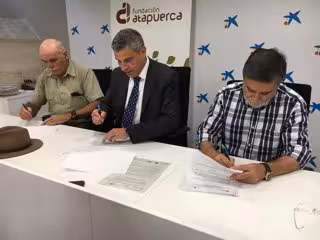 El convenido ha sido firmado este miércoles en la Casa del Cordón entre el director territorial de CaixaBank en Castilla y León y Asturias, Marc Benhamou, y el vicepresidente y director general de la Fundación Atapuerca, Eudald Carbonell y Javier Gutiérrez, respectivamente.