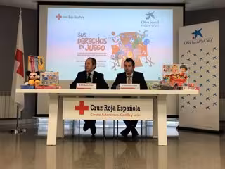 El Vicepresidente de Cruz Roja Castilla y León, Jesús Juanes, y el director de Instituciones de CaixaBank en Castilla y León y Asturias, Alberto Navarro, han presentado este miércoles la campaña de ayuda a para menores, en la que la entidad bancaria pone a disposición de la ONG 40.000 euros, que se distribuirán entre 1.500 menores de 480 familias en situación de exclusión o riesgo para poder facilitar la compra de juguetes en establecimientos comerciales de sus localidades.