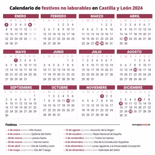 Castilla y León tendrá un total de 14 días festivos obligatorios en 2024, de los cuales 8 son festivos nacionales y 4 son festivos regionales. Además de ellos, cada municipio de la región dispondrá de dos festivos de carácter local que determinarán los propios ayuntamientos.