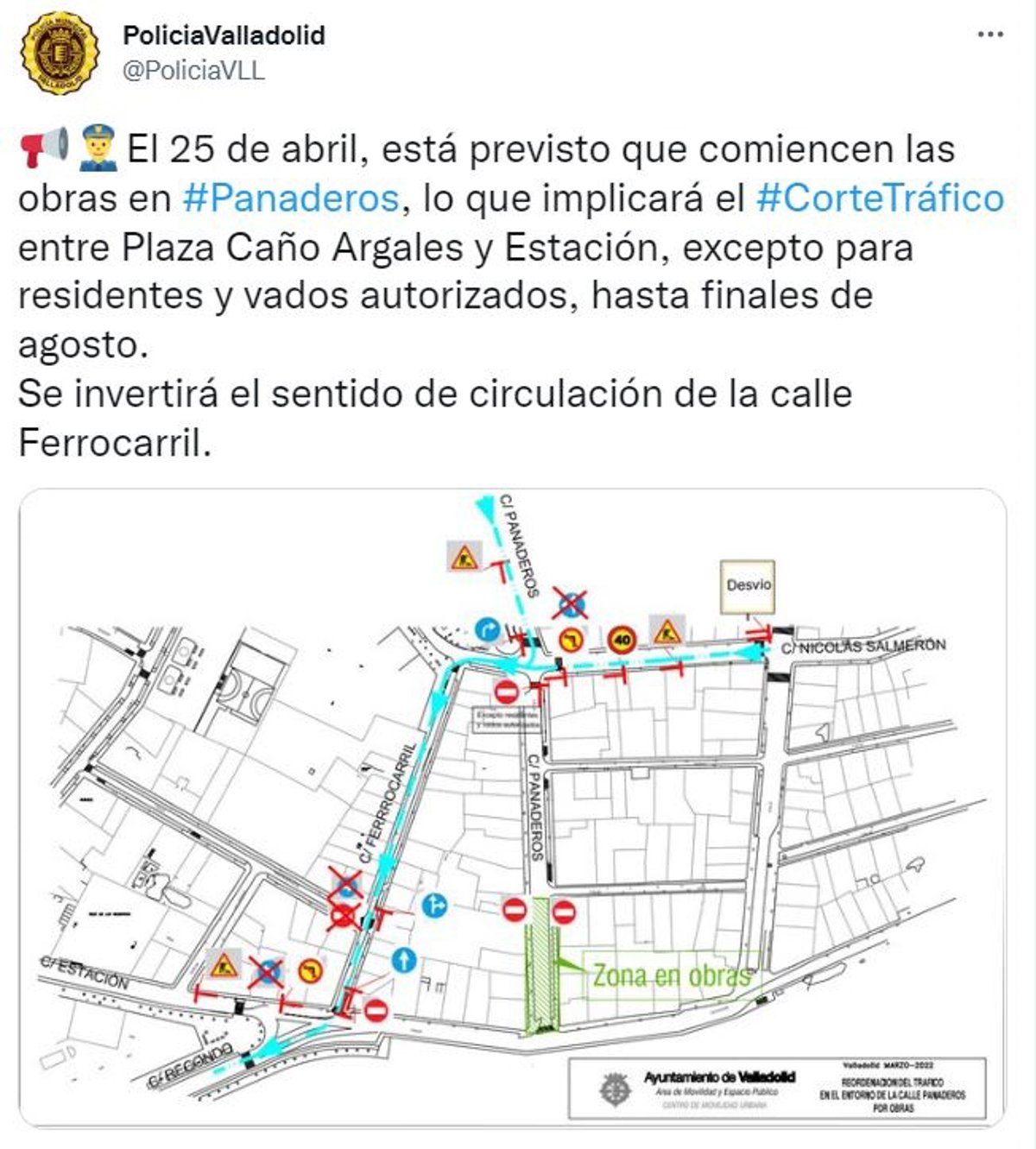 Aviso de la Policía Municipal de Valladolid sobre el corte de tráfico para el 25 de abril en la calle Panaderos. - POLICÍA MUNICIPAL DE VALLADOLID