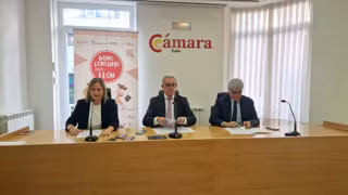 El presidente de la Cámara de Comercio de León, Javier Vega (centro), con la concejala de Comercio, Camino Orejas y el delegado de la Junta en León, Eduardo Diego, hacen balance de la Campaña Bono Consumo en León 2025. - EUROPA PRESS