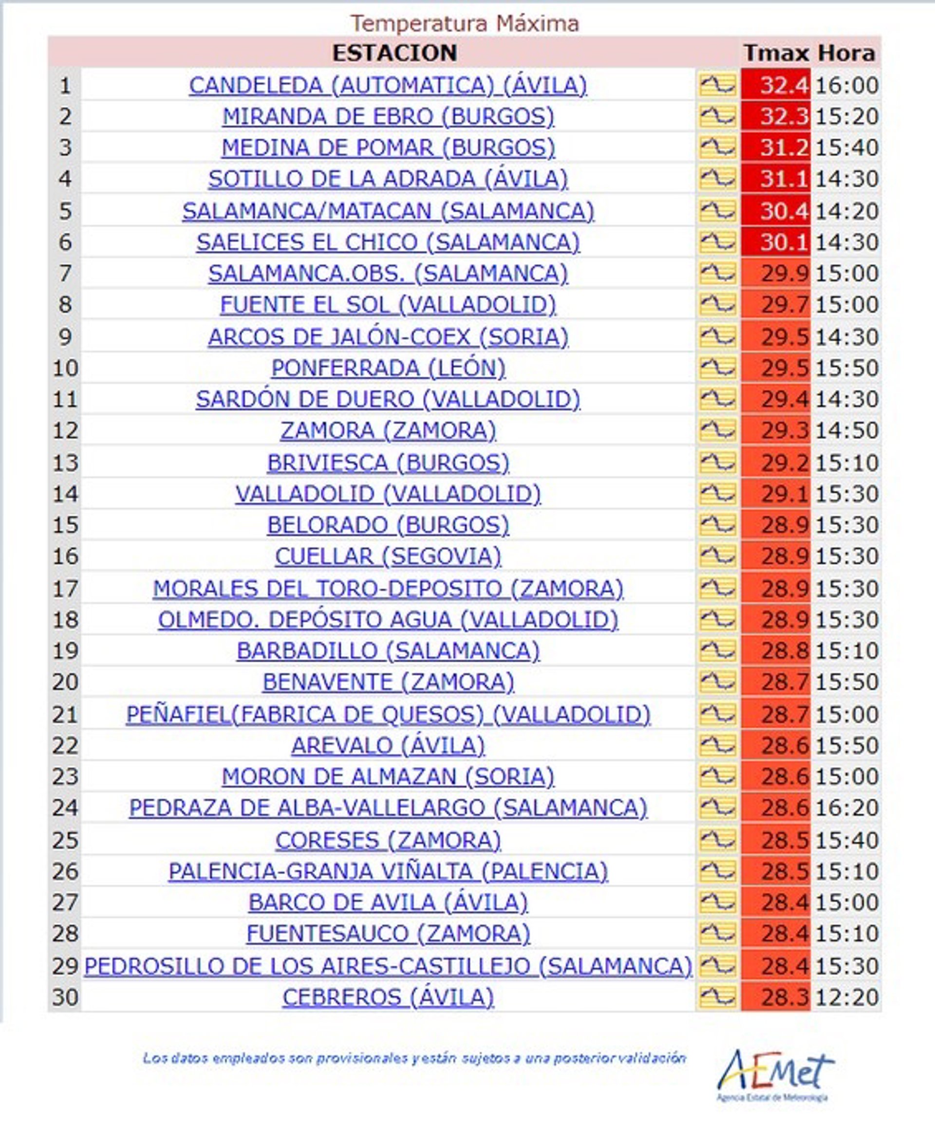 Ranking de las temperaturas máximas registradas en CyL en la jornada del jueves 28 de septiembre - @AEMET_CYL