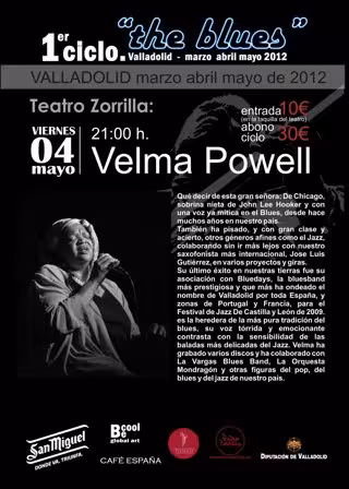 La cantante estadounidense Velma Powell cerrará mañana viernes en la sala Experimental del teatro Zorrilla de Valladolid el I ciclo de Blues, que desde el pasado 30 de marzo se ha desarrollado en este espacio.