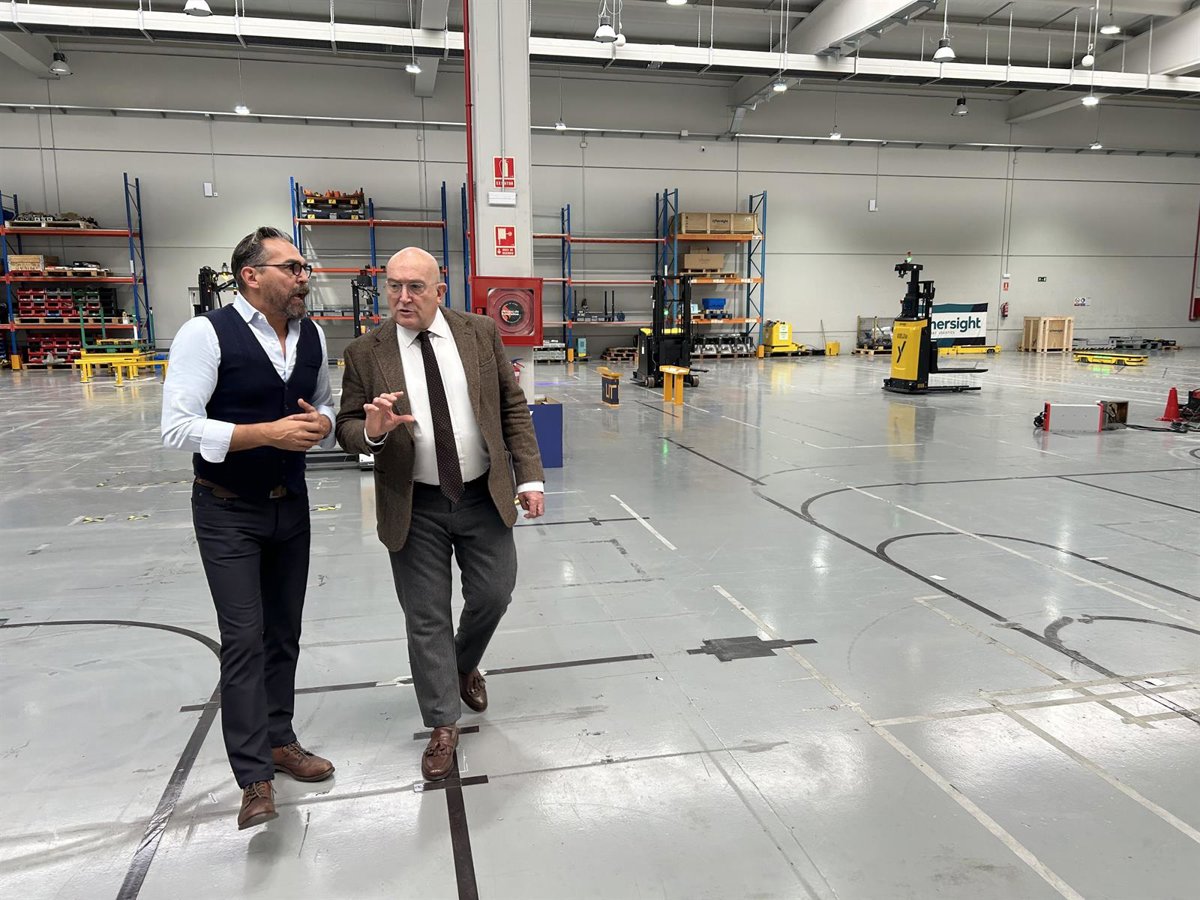 El CEO de Synersight, Tony Martínez, y el alcalde de Valladolid, Jesús Julio Carnero, en la zona de pruebas de vehículos autónomos y robots móviles de la nava de la empresa en el polígono de San Cristóbal. - EUROPA PRESS