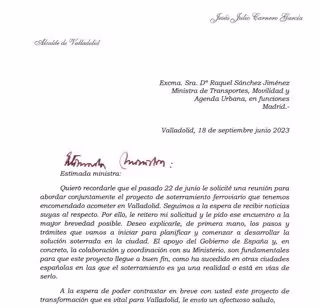 "Seguimos a la espera de recibir noticias suyas al respecto", reprocha Jesús Julio Carnero a Raquel Sánchez en esta nueva carta en la que pide una reunión "a la mayor brevedad posible" para poder explicar a la ministra los pasos y trámites que va a iniciar el Consistorio para planificar y comenzar a desarrollar la "solución soterrada" en la ciudad.