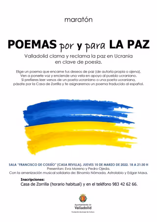 La Fundación Municipal de Cultura ha convocado el maratón 'Poemas por y para la paz' en apoyo al pueblo ucraniano el próximo 10 de marzo, que tiene por objetivo que la voz de los vallisoletanos "testimonie su incondicional solidaridad" en la "trágica" situación ocasionada por la invasión rusa del país y que estará coordinado por la Casa de Zorrilla.