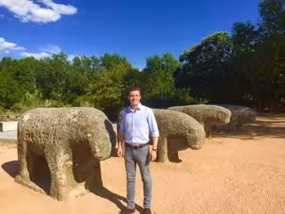 El presidente nacional del Partido Popular y diputado por Ávila, Pablo Casado, ha mostrado su apoyo a la conmemoración del 550 aniversario del Tratado de los Toros de Guisando, con la publicación en sus perfiles de redes sociales de una fotografía junto a estas esculturas zoomorfas.