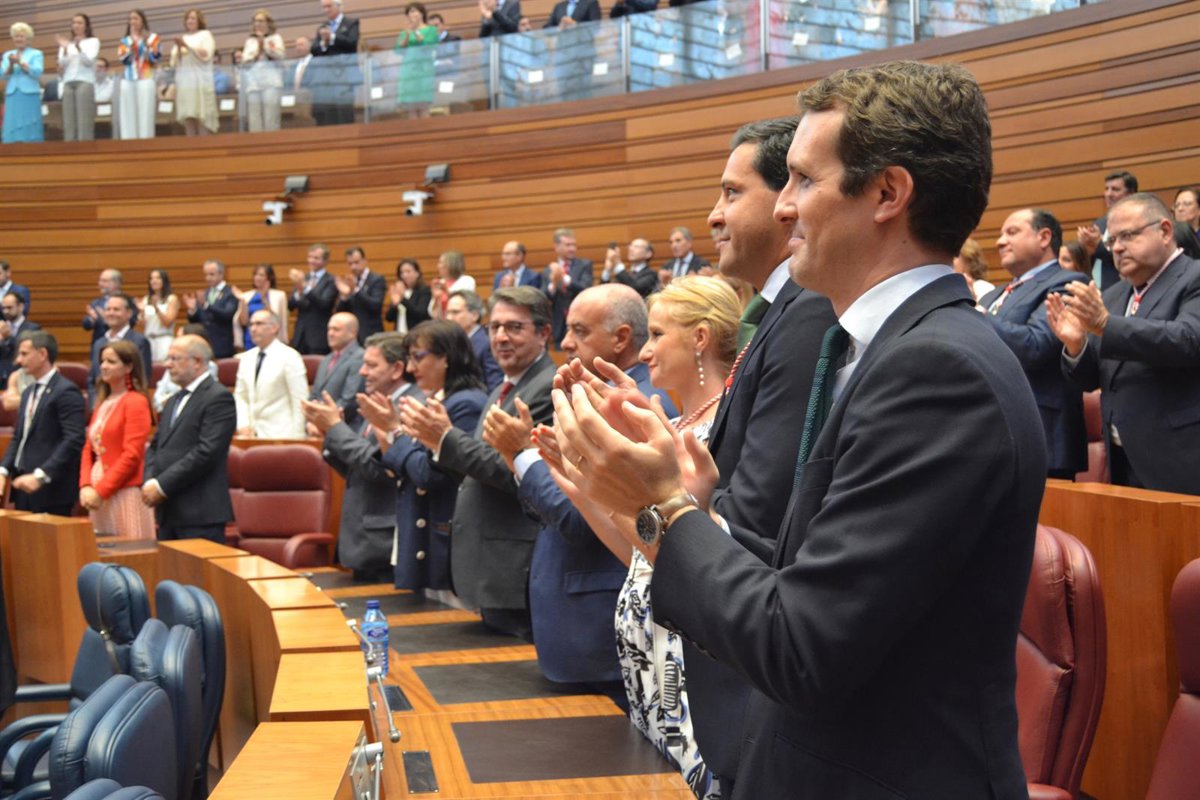 En el salón de recepciones de las Cortes de Castilla y León Pablo Casado ha asegurado que ha sido para él un "honor" asistir a la toma de posesión de Fernández Mañueco, un momento en el que ha aprovechado para darle la enhorabuena por la que, a su juicio, ha sido una "brillante" campaña electoral en la que se ha presentado un "acertado programa" con un "muy positivo" balance de gestión.