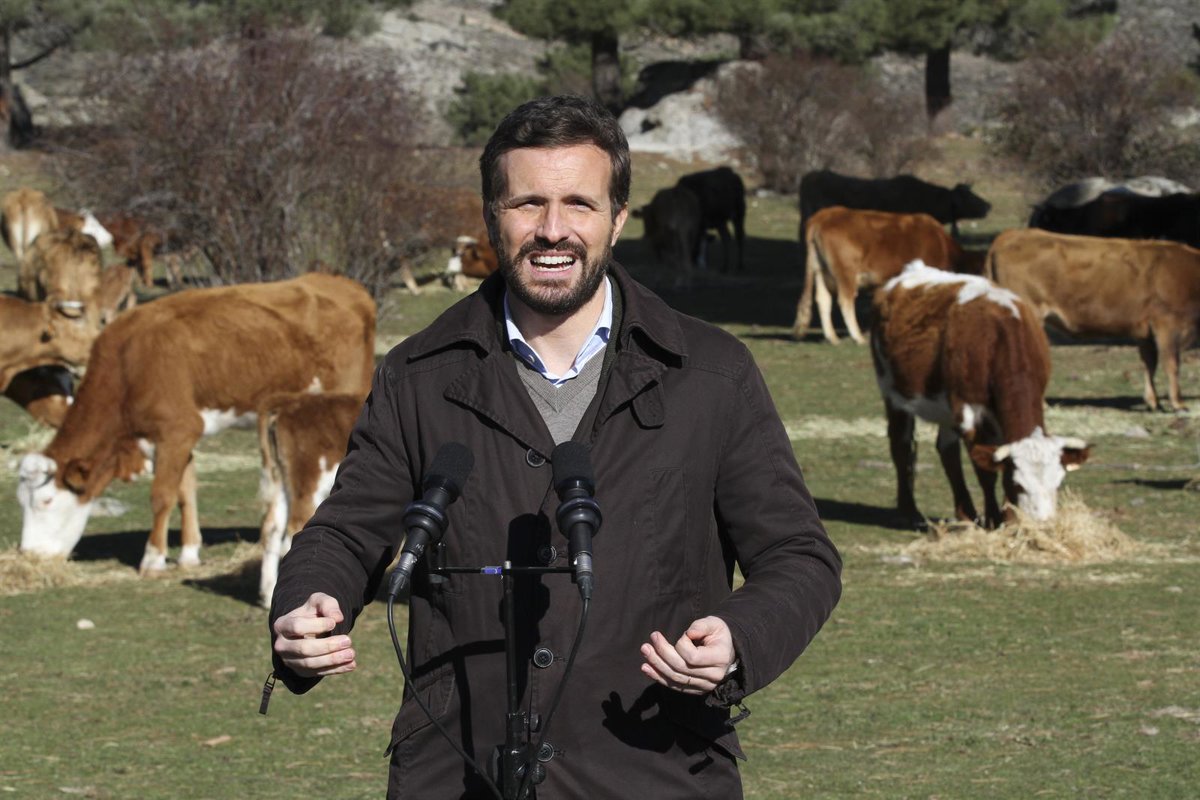 El presidente del PP, Pablo Casado, ofrece declaraciones a los medios, durante su visita a una explotación ganadera extensiva de vacuno en Navas del Marqués, a 14 de enero de 2022, en Navas del Marqués, Ávila, Castilla y León (España). - Rafael Bastante - Europa Press