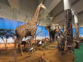 Una hiena manchada, un antílope jeroglífico, impalas, leones, babuino, jirafa, cobo del Nilo, elefante, ganso, pato, leopardo, ñu de cola blanca, avutarda, carracas, cercopiteco o grullas se adueñan de los espacios expositivos, en los que a través de pantallas se puede conocer información de animales así como los sonidos que emiten.