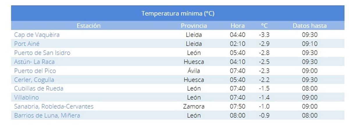 En quinta posición se sitúa Puerto del Pico (Ávila), con -2,3 grados; seguida de Cerler Cogulla (Huesca), con -2,2; Cubillas de Rueda (León), con -1,5; Villablino, con -1,4; Sanabria (Zamora), con -1, y Barrios de Luna (León), con -0,9 grados.