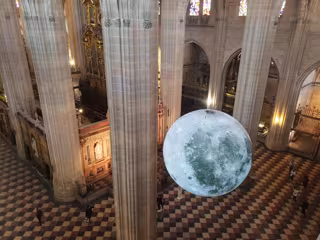 Una luna gigante de 7 metros de diámetro en el trascoro de la Catedral de Segovia sorprende a los visitantes de la exposición 'Museum of the Moon' (Museo de la Luna) que se ha inaugurado este viernes y que forma parte de los actos de celebración del 500 aniversario de la colocación de la primera piedra de la seo segoviana.