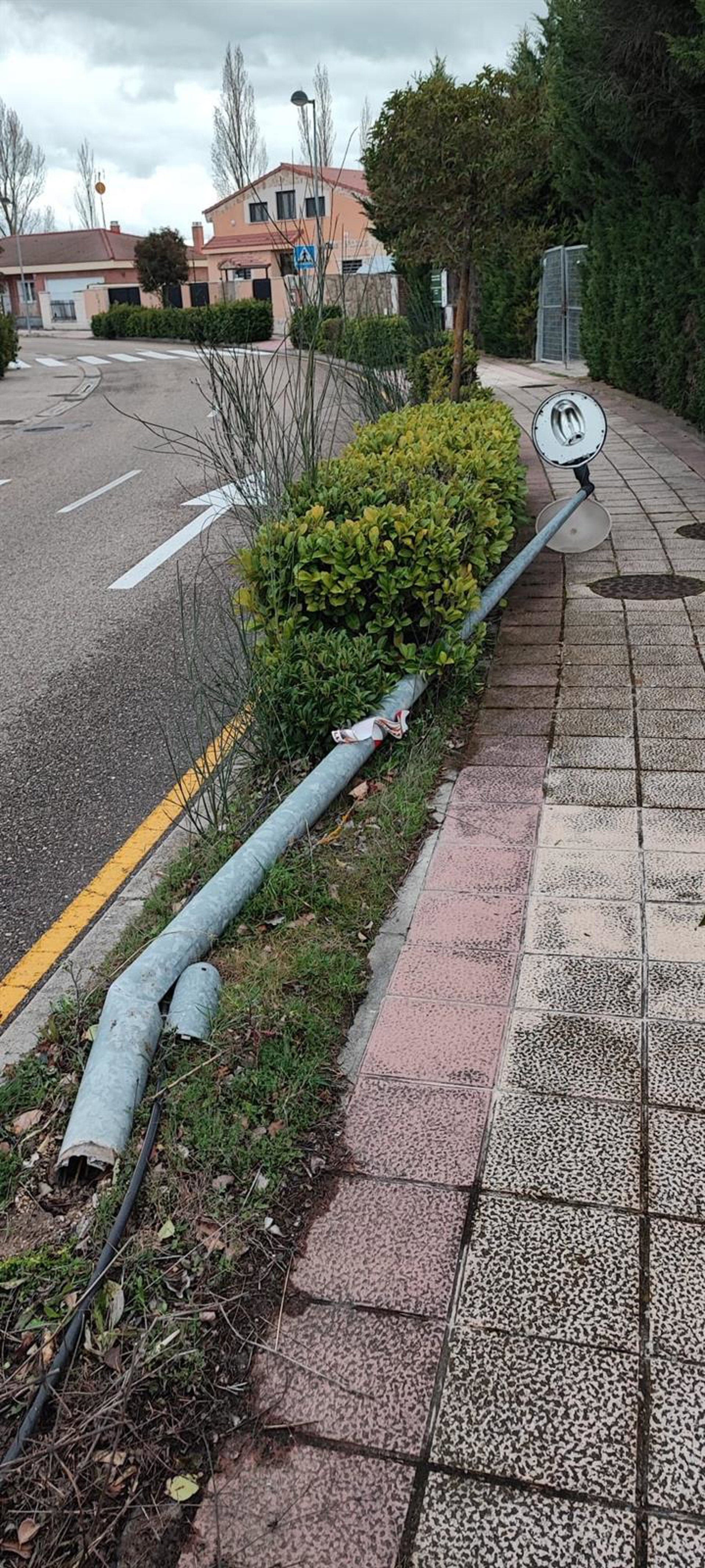 CCD en Aldeamayor (Valladolid) eleva al pleno medidas ante los últimos accidentes de tráfico en el municipio. En la foto, una farola derribada por un turismo tras un accidente. - CCD
