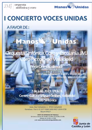 El Centro Cultural Miguel Delibes acoge este viernes, 7 de julio, a las 19.30 horas, en la Sala Sinfónica Jesús López Cobos, el concierto 'Voces Unidas', con el que Manos Unidas y la Orquesta Sinfónica Coro y Escolanía JMJ se unen para celebrar un concierto benéfico en el que la recaudación irá destinada a Manos Unidas en su lucha contra el hambre y las causas que la provocan.